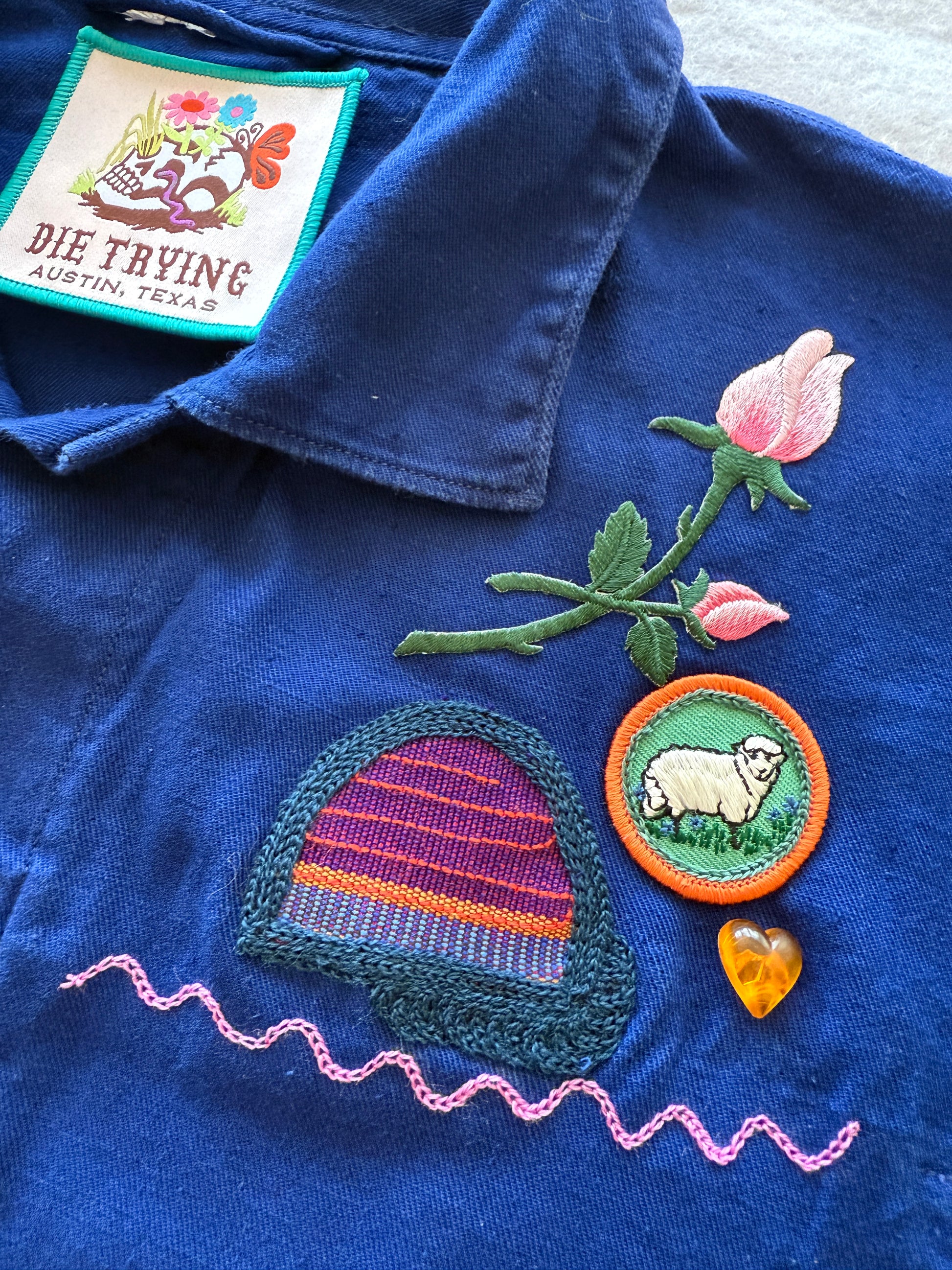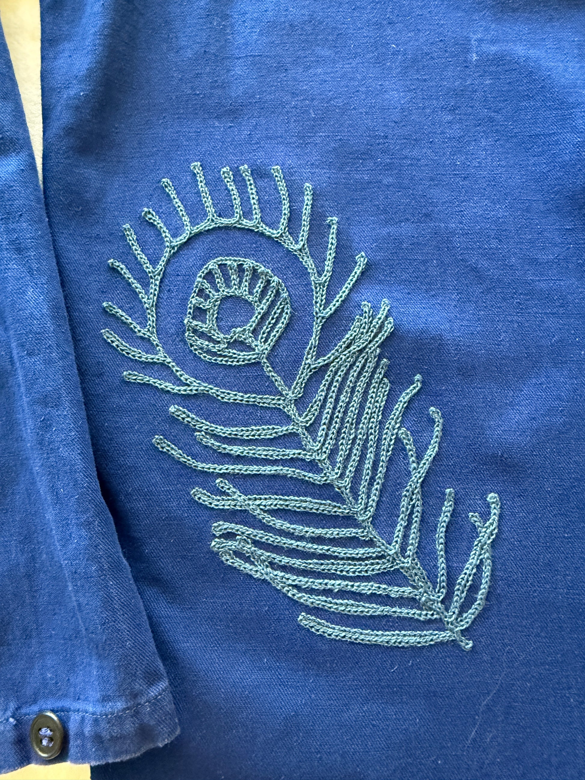 One of a kind, vintage blue french chore coat with chainstitch embroidery, vintage patches, and buttons. Front chest inside pocket. Good vintage condition. 100% soft lightweight cotton. Embroidered with wool blend and cotton thread.