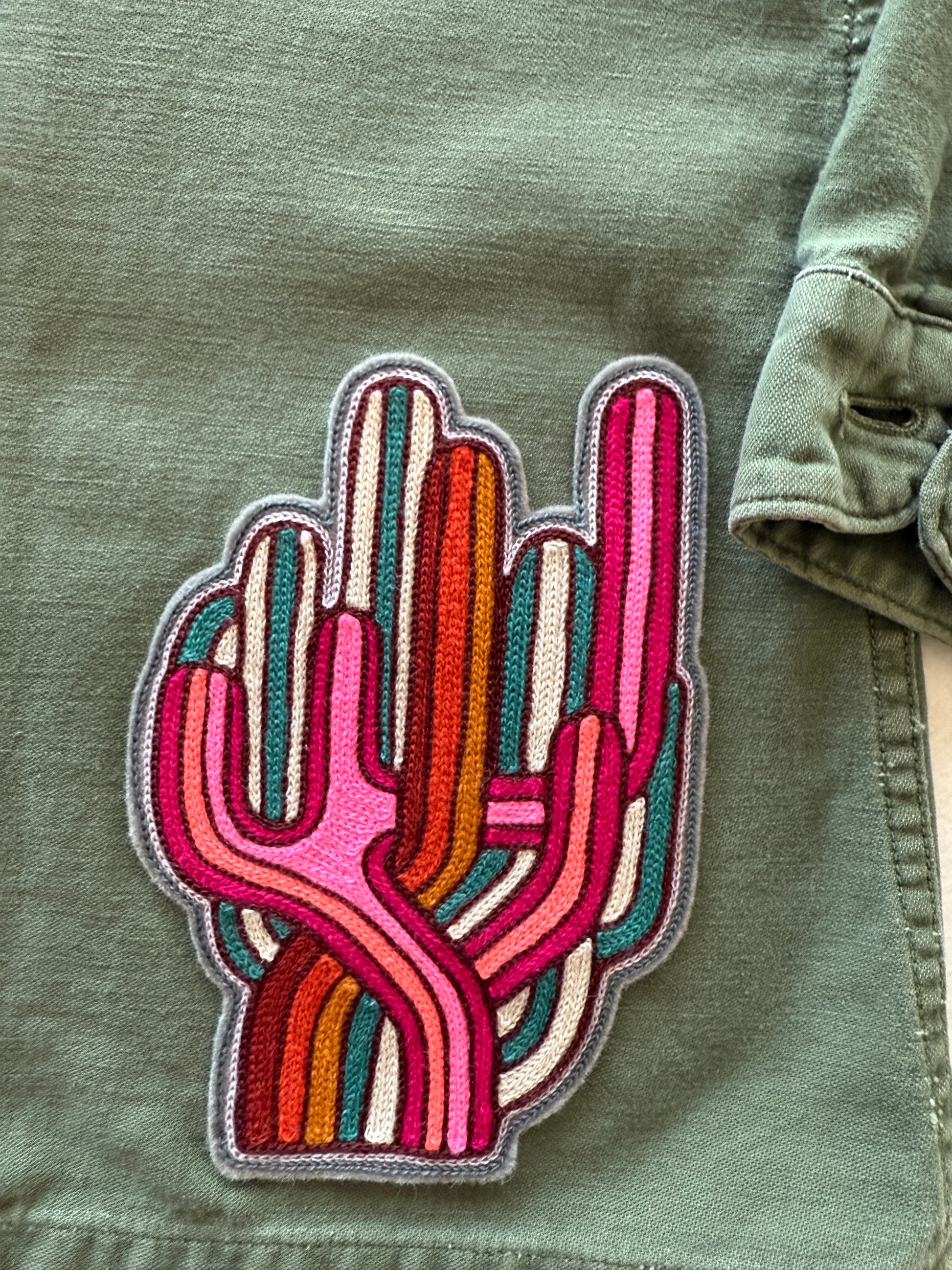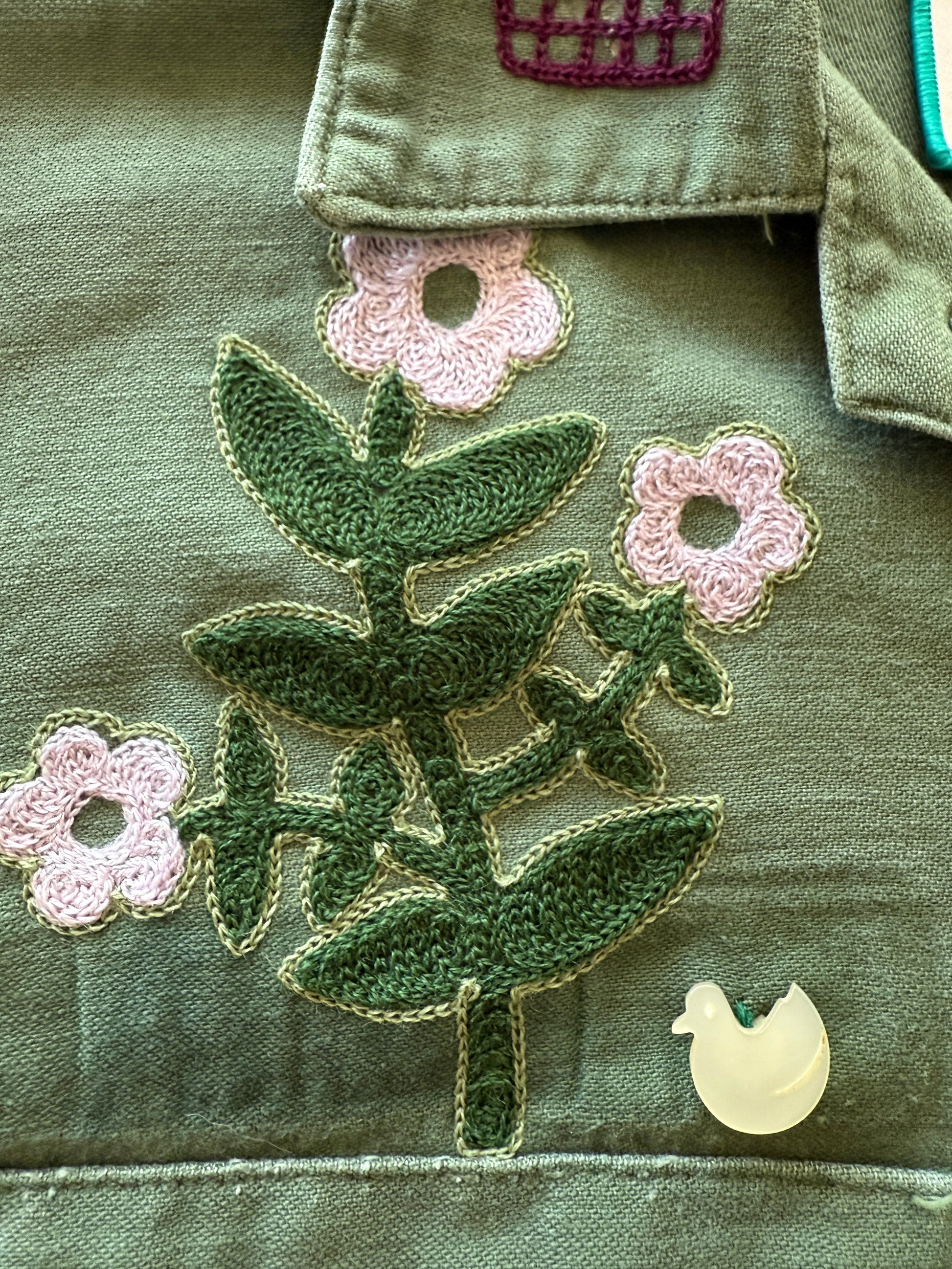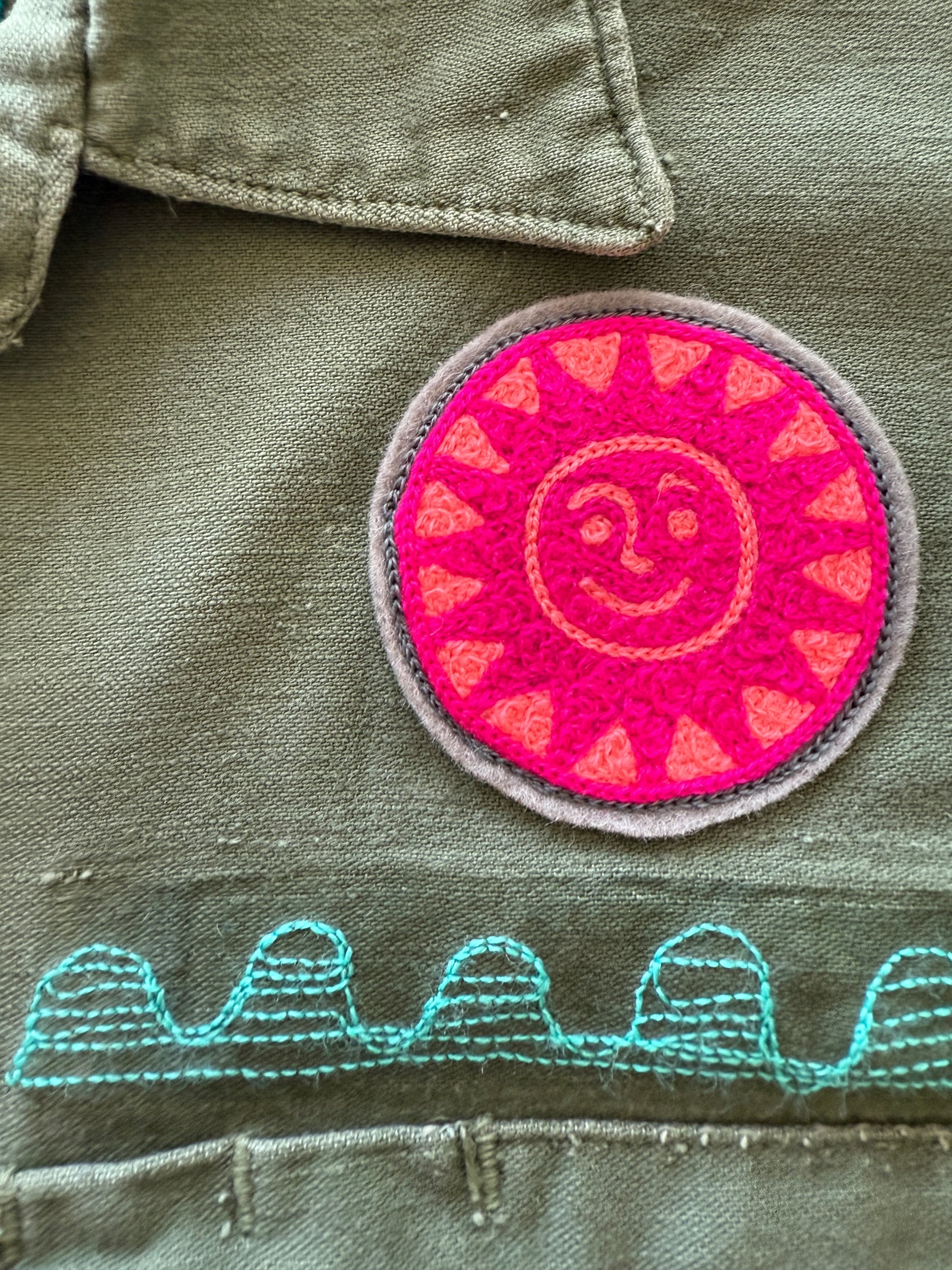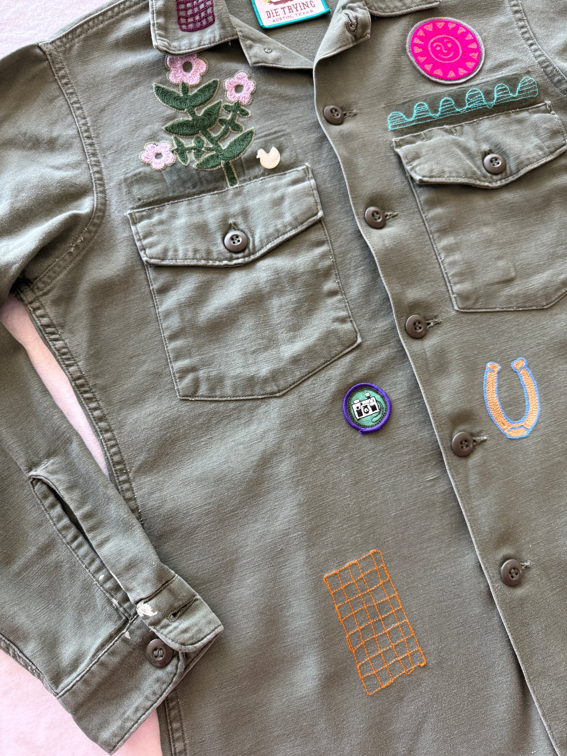 One of a kind, 70s vintage button down military shirt with chainstitch embroidery, vintage patches, and buttons. Front chest pockets and button cuff sleeves. Super soft 100% cotton. Good vintage condition with some small white paint splatter on cuff and sleeve. Embroidered with wool blend and cotton thread. Add an interior pocket with initials here!