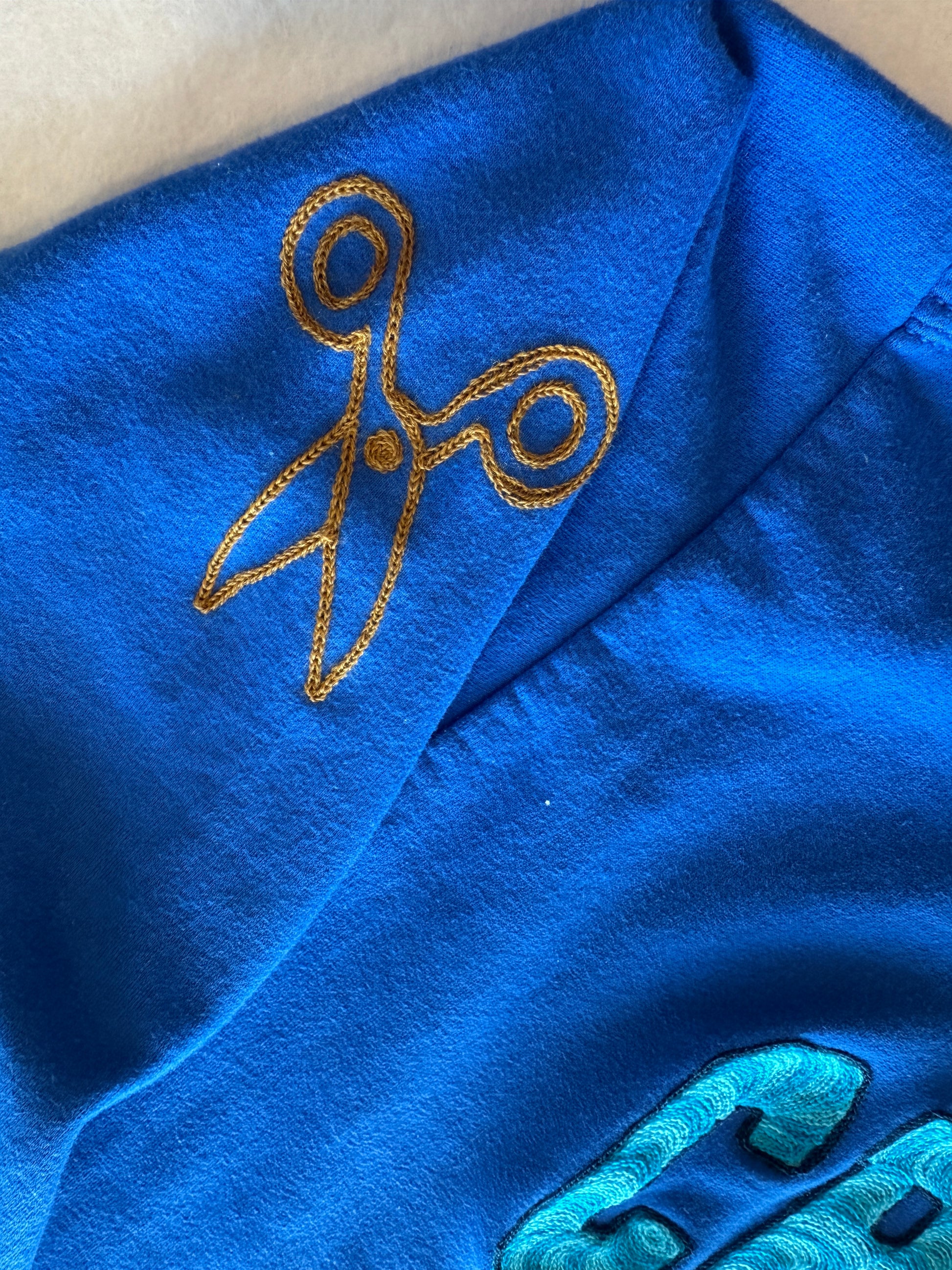 Thrifted pretty cobalt blue sweatshirt. Good vintage condition and super soft. Embroidered with wool blend and cotton thread.