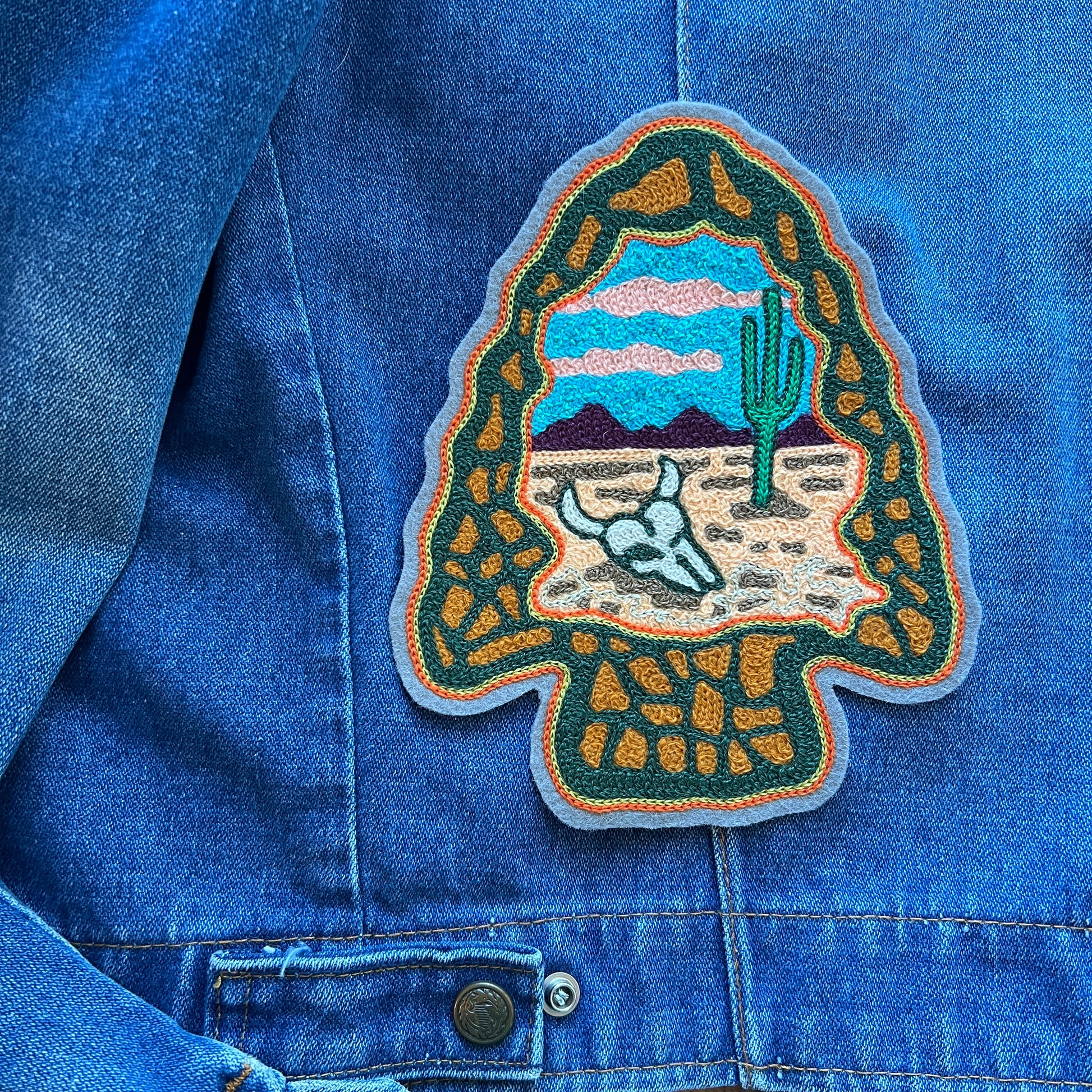 Handmade chainstitch embroidered patch. Made one stitch at a time on our antique embroidery machines. Size: 6" x 7"