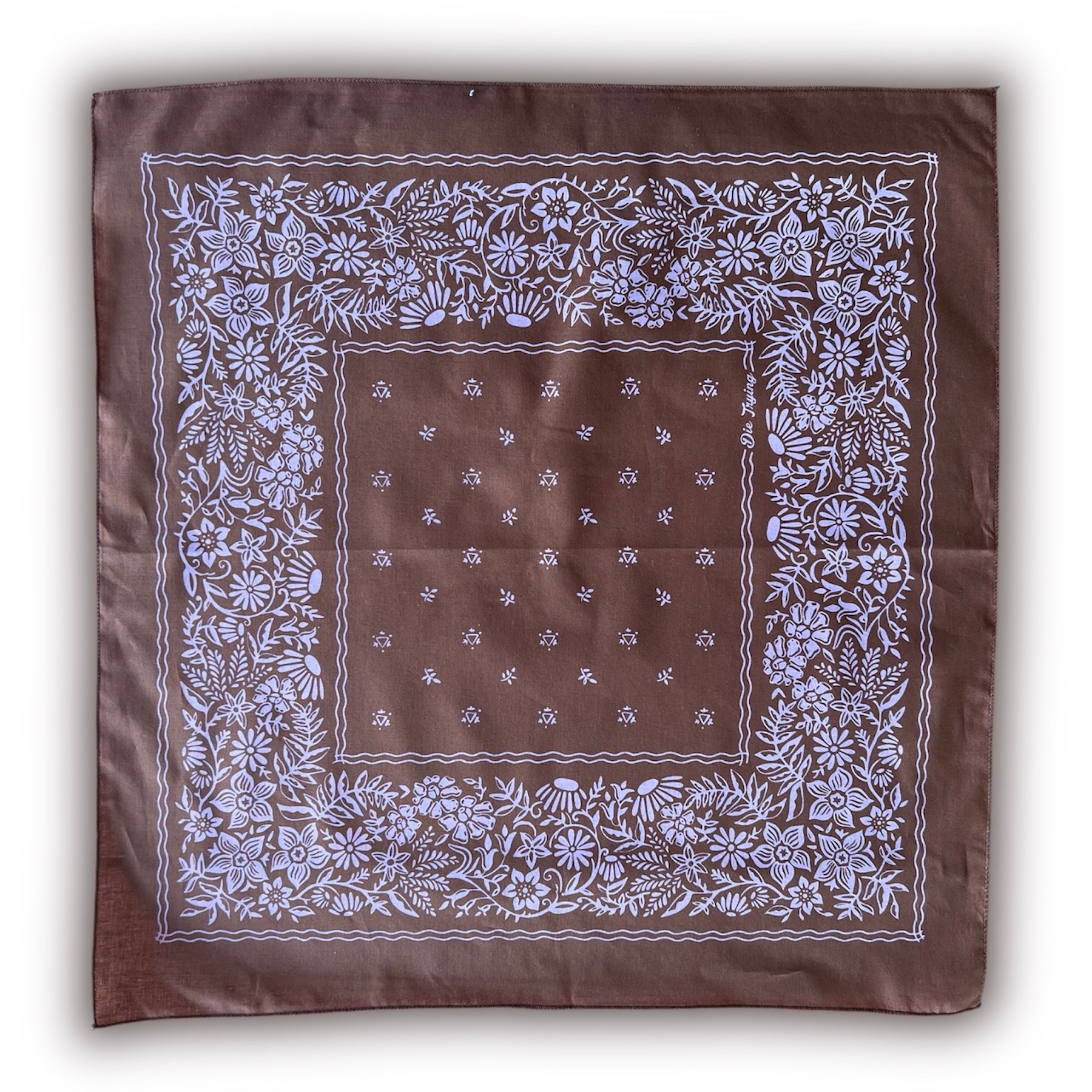 Dark brown cotton bandana screen printed with our signature floral design in lavender. Enter custom text and choose thread color. Cursive only. These are done freehand (not digital) so we can't do specific fonts or all capital letters.