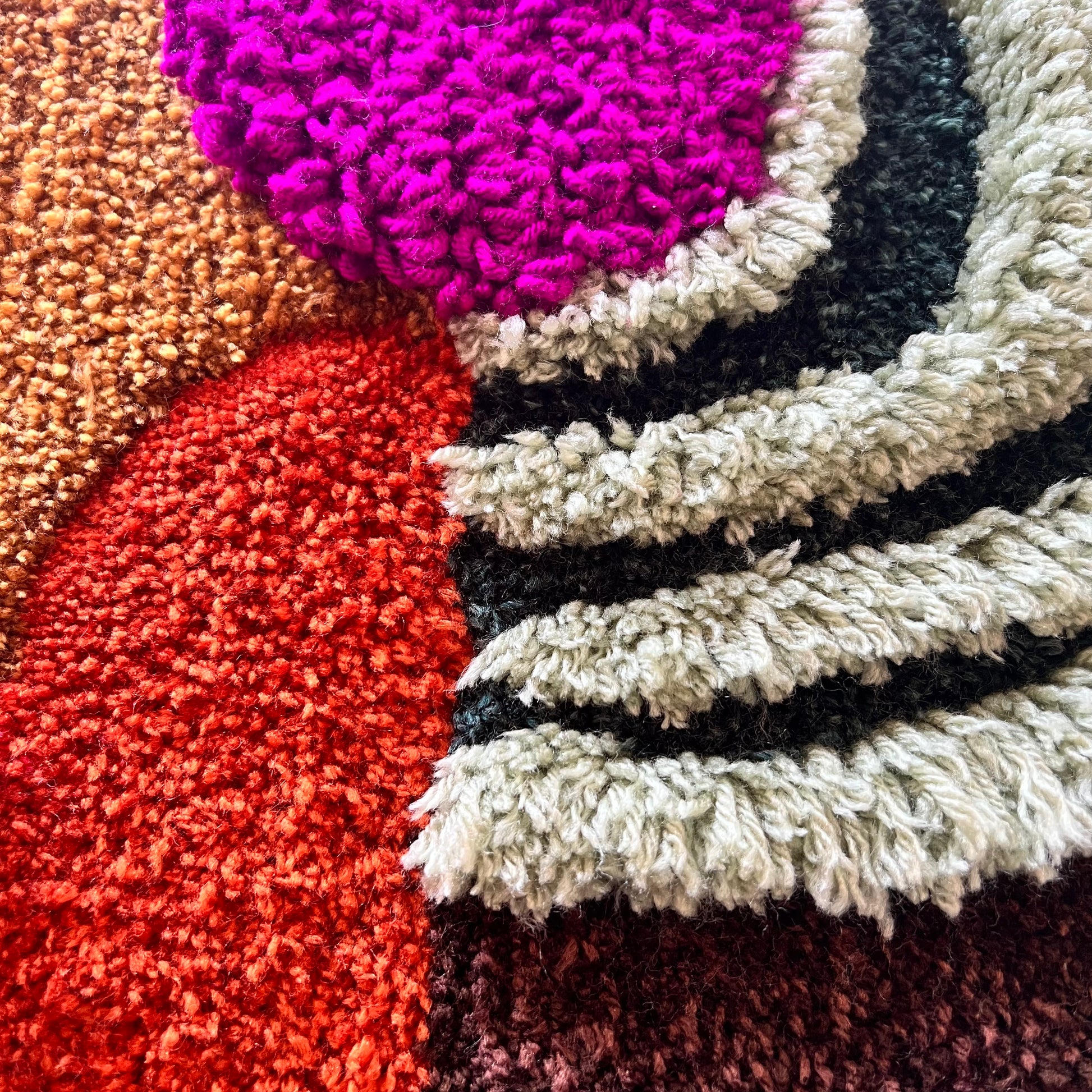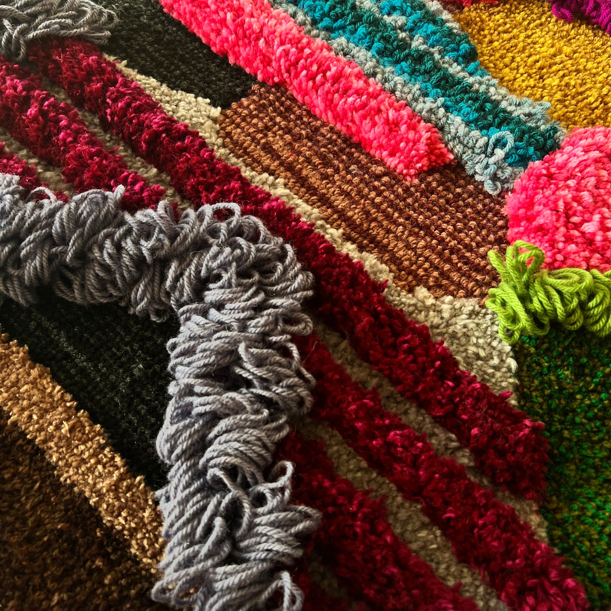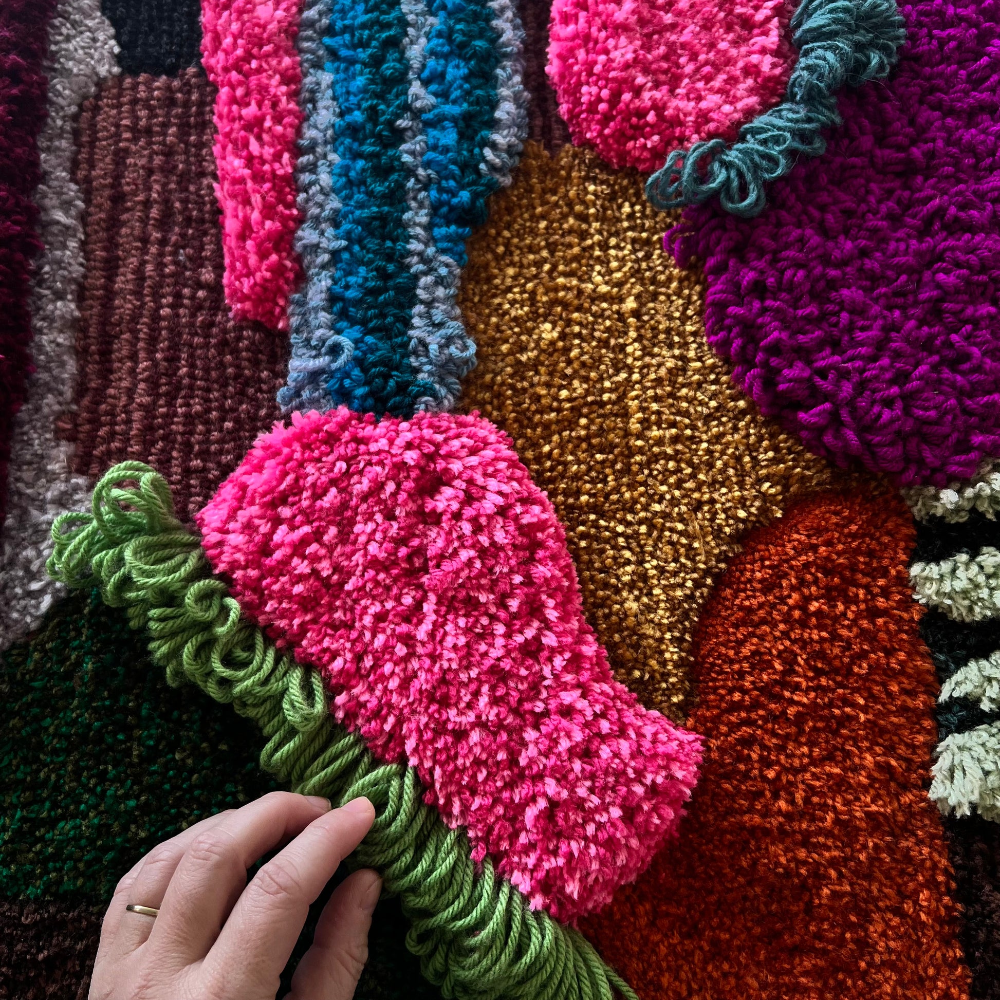 Original tufted wall hanging made with a variety of acrylic and wool fibers. Mounted on a wood backing with picture framing wire attached, ready to hang.