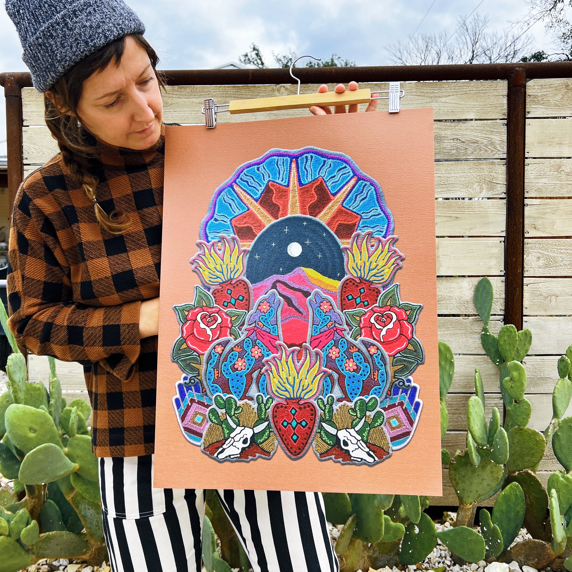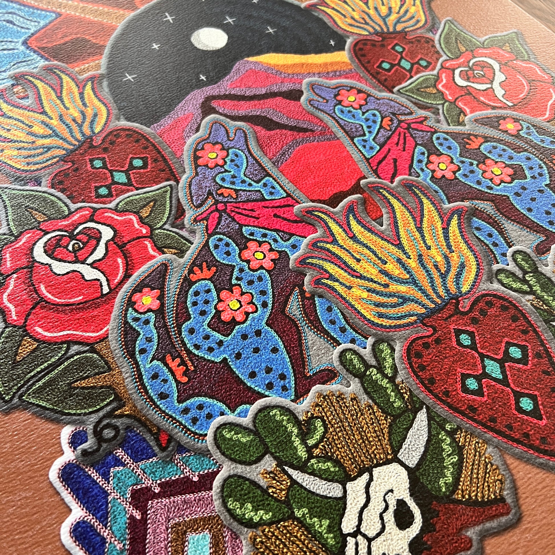 "18 x24" patch collage art print. Printed on heavy card stock. Paper texture has a leather like look resulting in a really unique print.