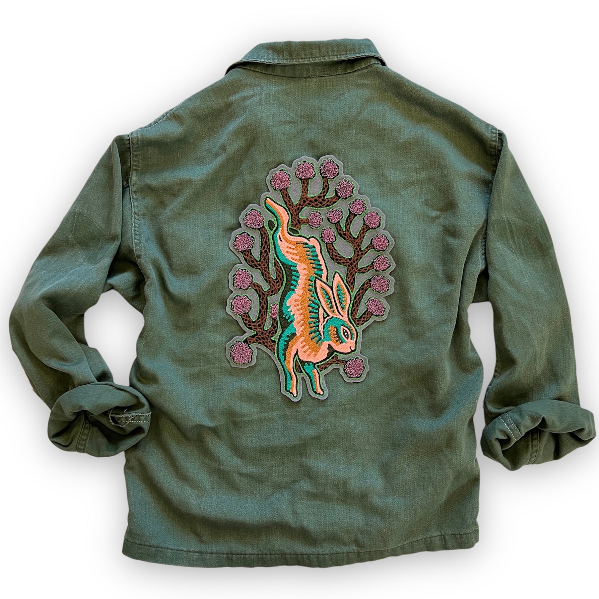 Leaping jackrabbit backpatch with a combination of chenille and chainstitch. Embroidered one at a time on our antique machines. Wool blend thread on gray felt. Finished with iron-on backing.