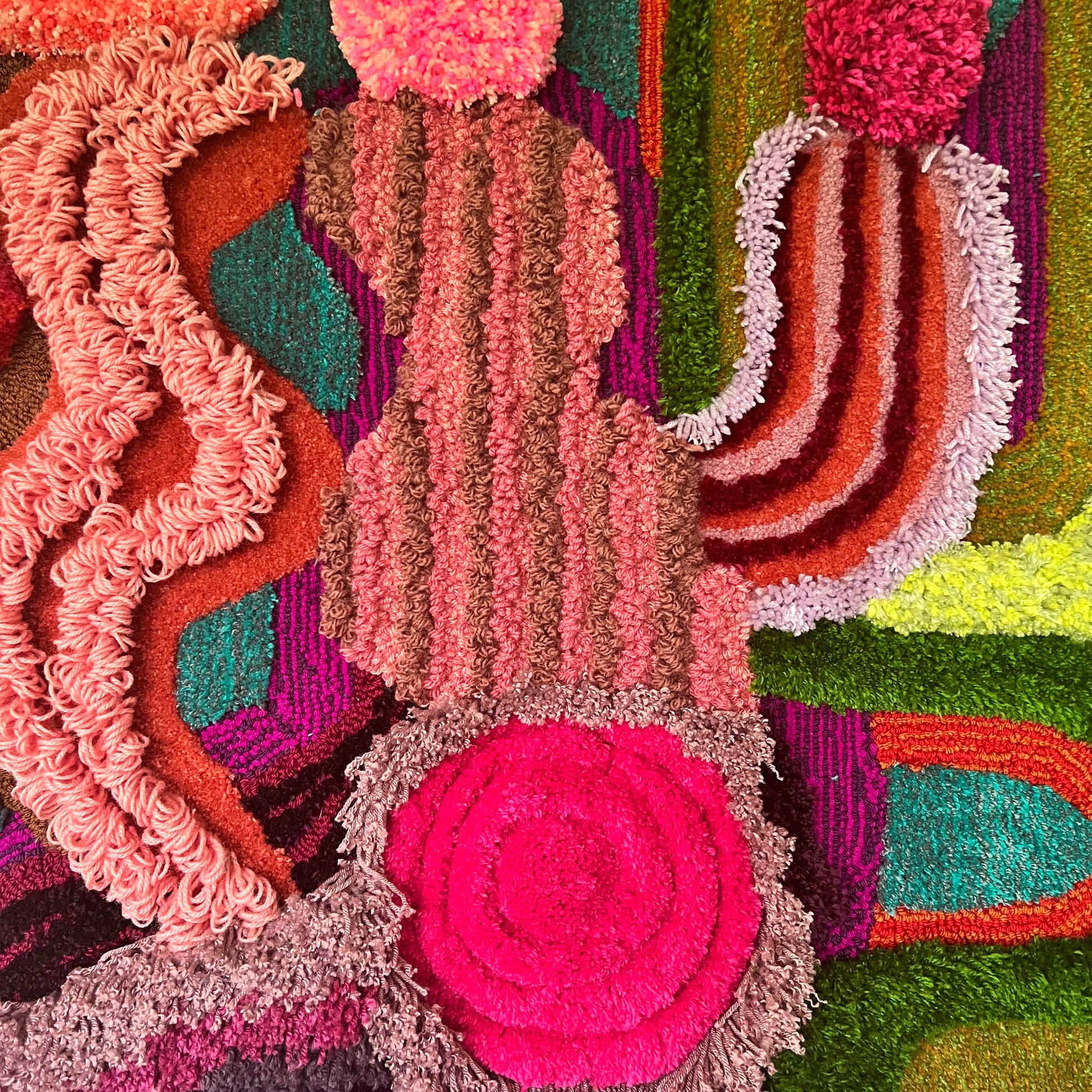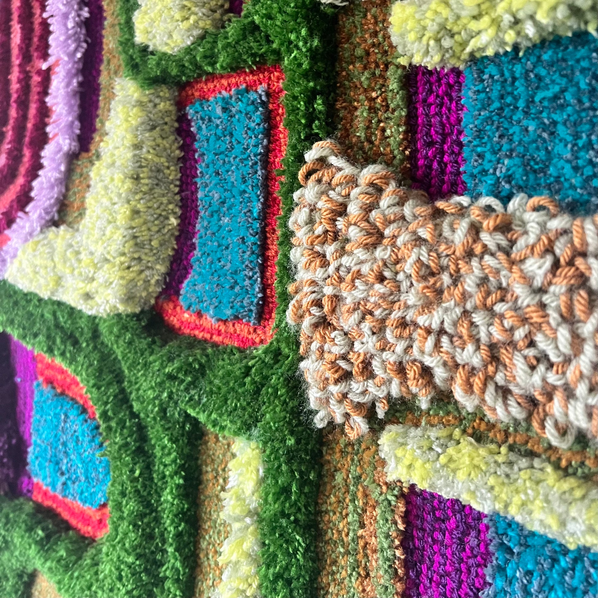 Original tufted wall hanging made with a variety of acrylic and wool fibers. Mounted on a wood backing with picture framing wire attached, ready to hang.