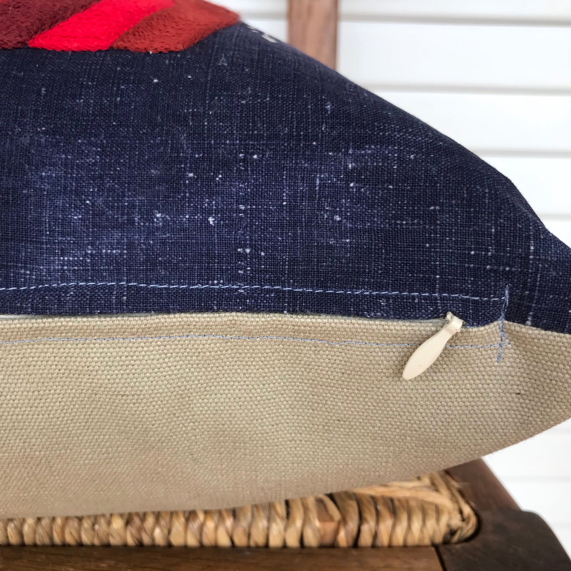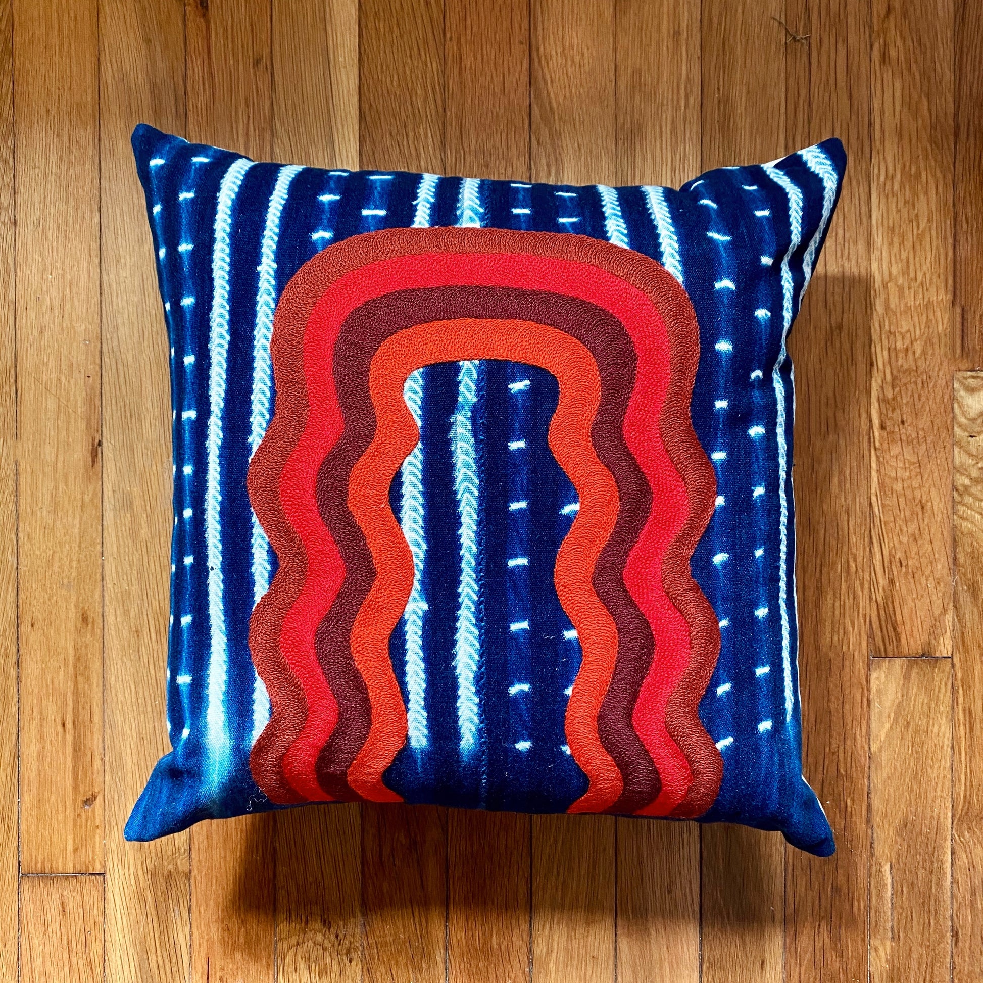 First picture is what's currently available. Handmade chainstitch embroidered pillow. Stitched onto vintage fabric and finished with a hidden zipper. All inside seams are serged for extra durability. Made from start to finish in our Austin studio.