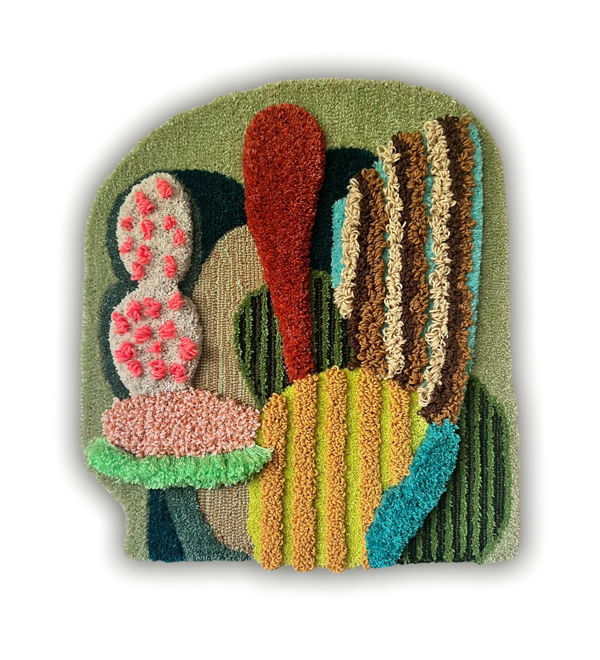 Original tufted wall hanging made with a variety of acrylic and wool fibers. Mounted on a wood backing with picture framing wire attached, ready to hang.