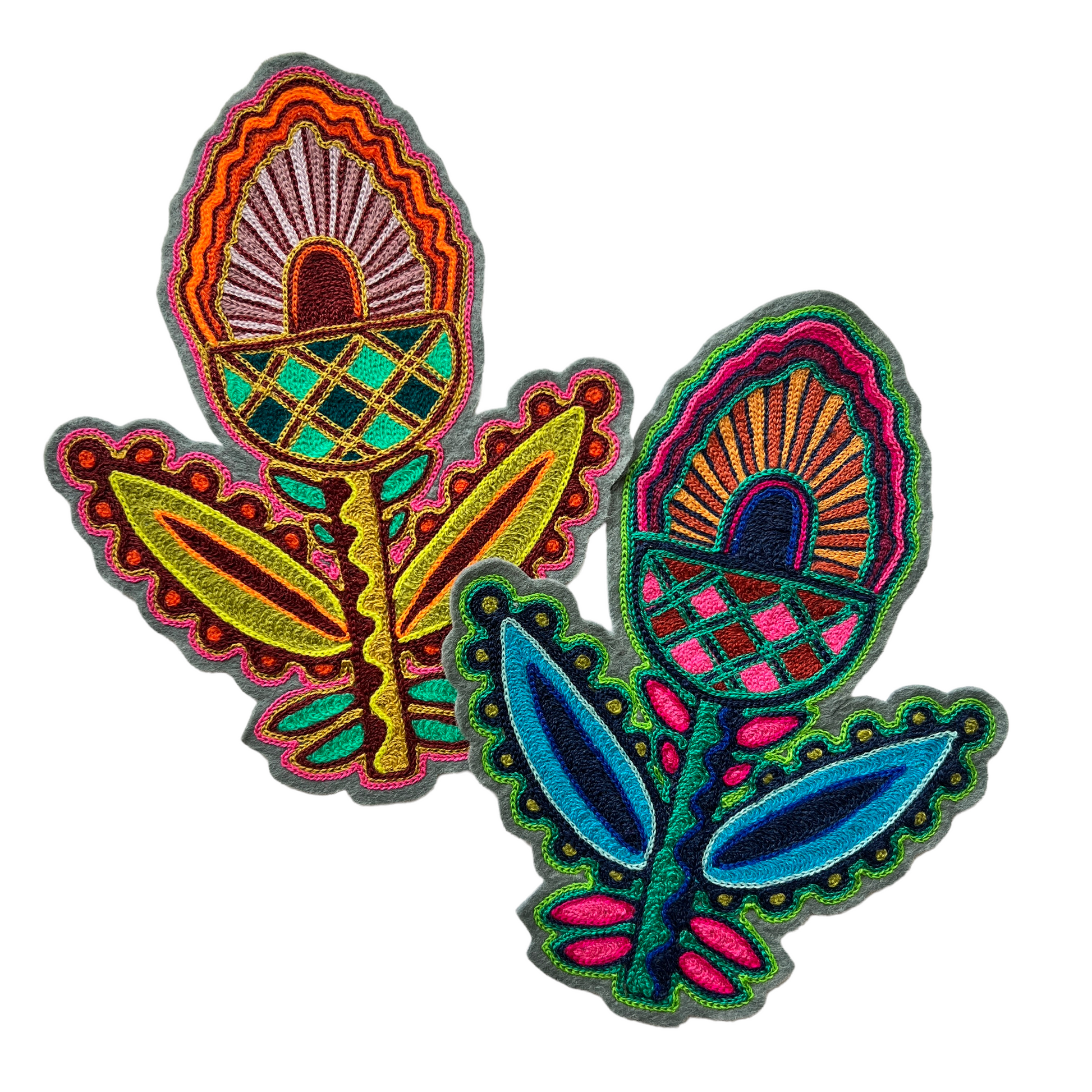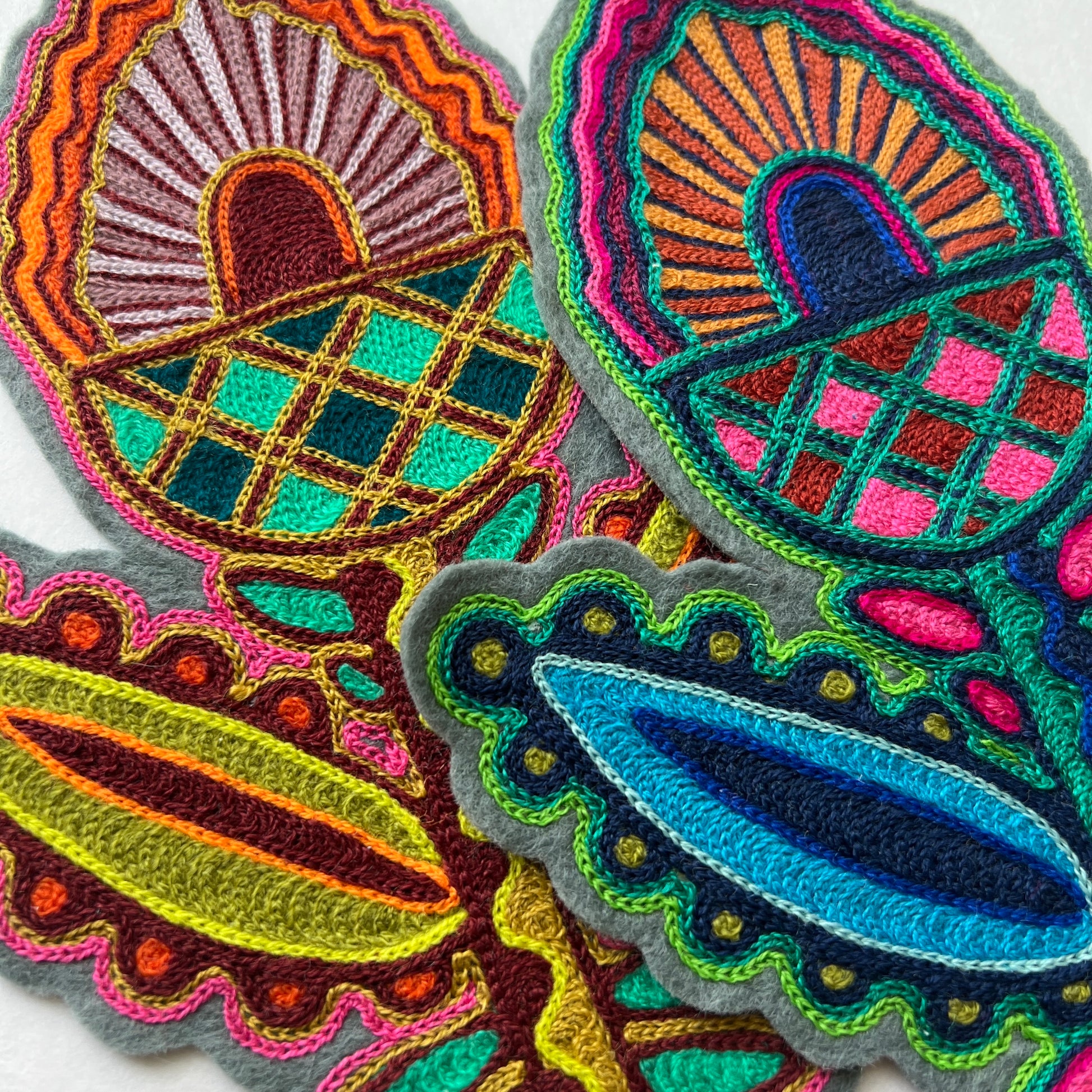Handmade chainstitch embroidered patch. Made one stitch at a time on our antique embroidery machines. Size: 8.5" x 6.5"