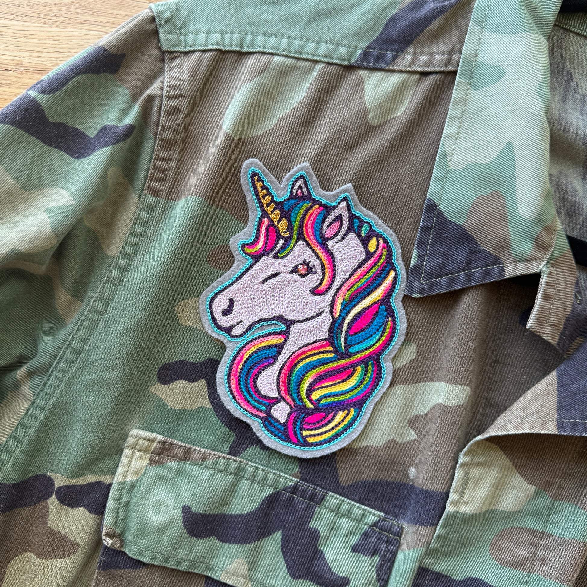 Unicorn patch with tiny rhinestone eye. Handmade chainstitch embroidered patch. Made one stitch at a time on our antique embroidery machines. Size: 4" x 5.75"