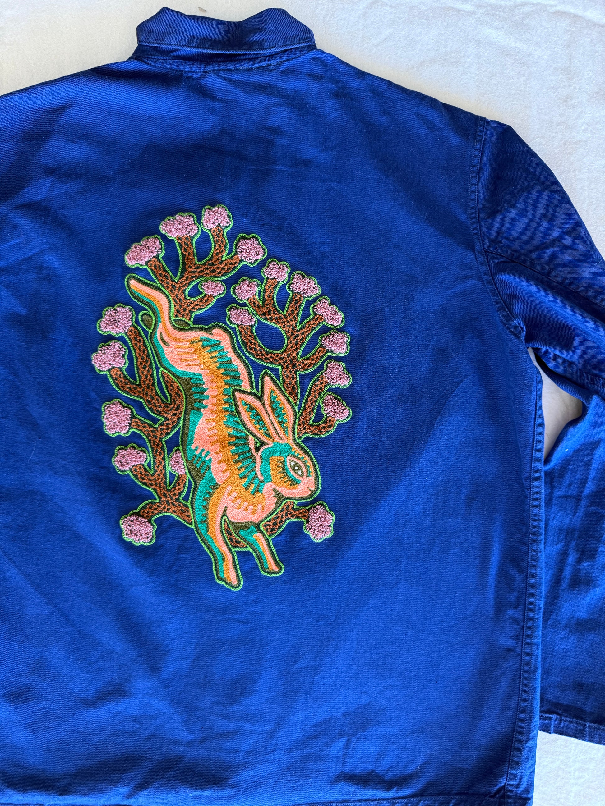 One of a kind, vintage blue french chore coat with chainstitch embroidery, vintage patches, and buttons. Front chest inside pocket. Good vintage condition. 100% soft lightweight cotton. Embroidered with wool blend and cotton thread.