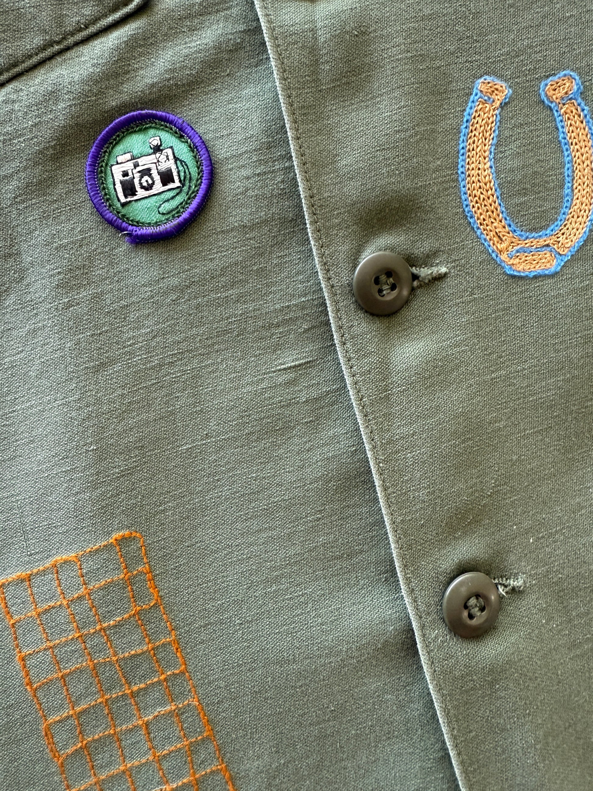 One of a kind, 70s vintage button down military shirt with chainstitch embroidery, vintage patches, and buttons. Front chest pockets and button cuff sleeves. Super soft 100% cotton. Good vintage condition with some small white paint splatter on cuff and sleeve. Embroidered with wool blend and cotton thread. Add an interior pocket with initials here!