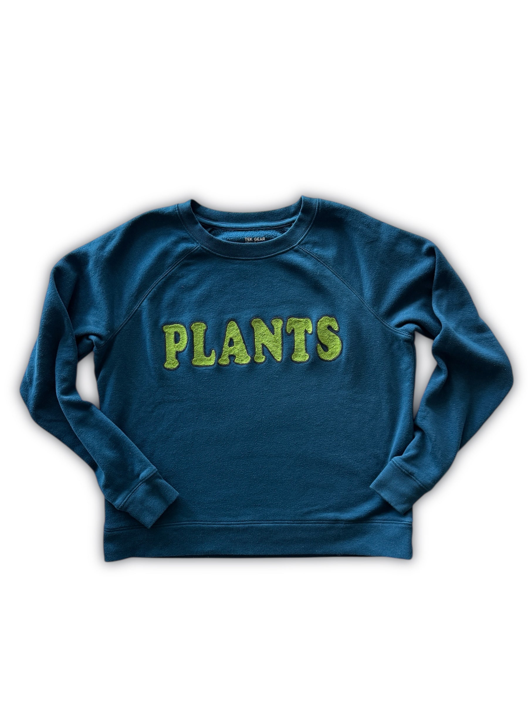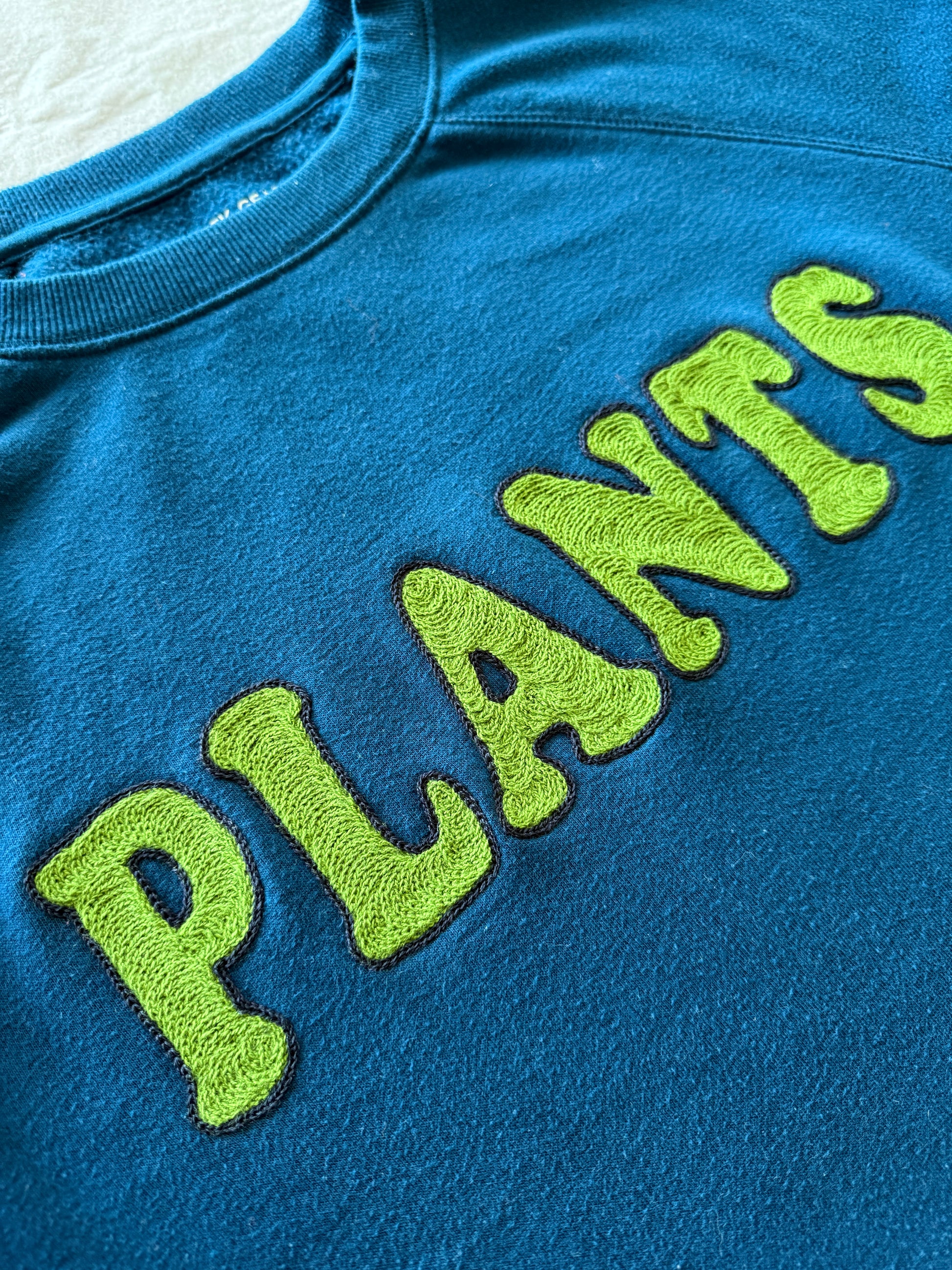 Thrifted dark teal sweatshirt with raglan sleeves. Good vintage condition and super soft. Embroidered with wool blend and cotton thread.